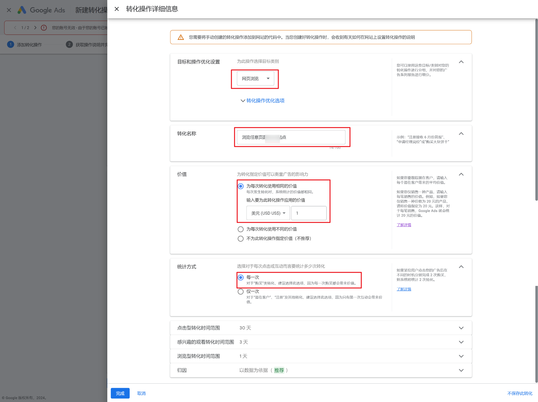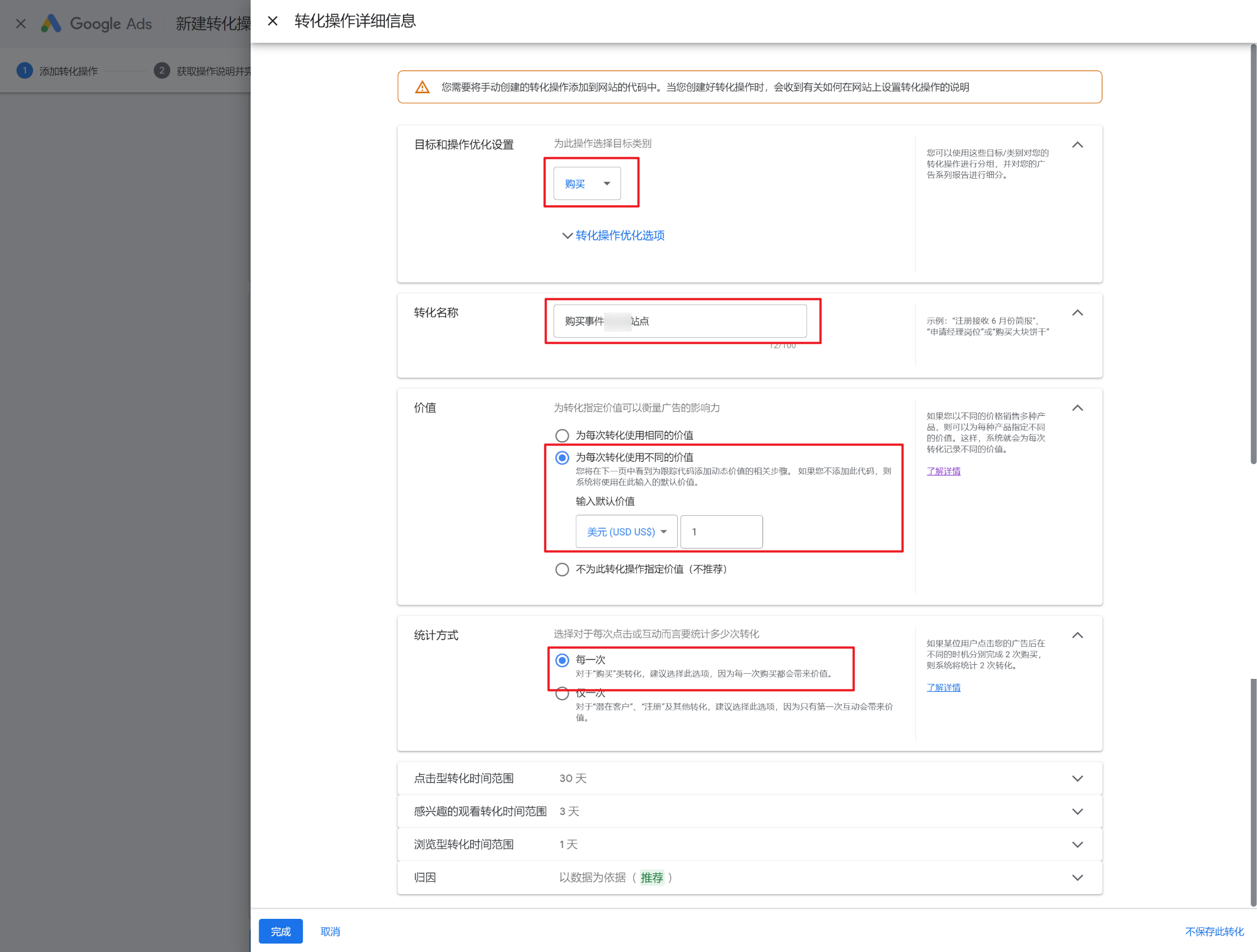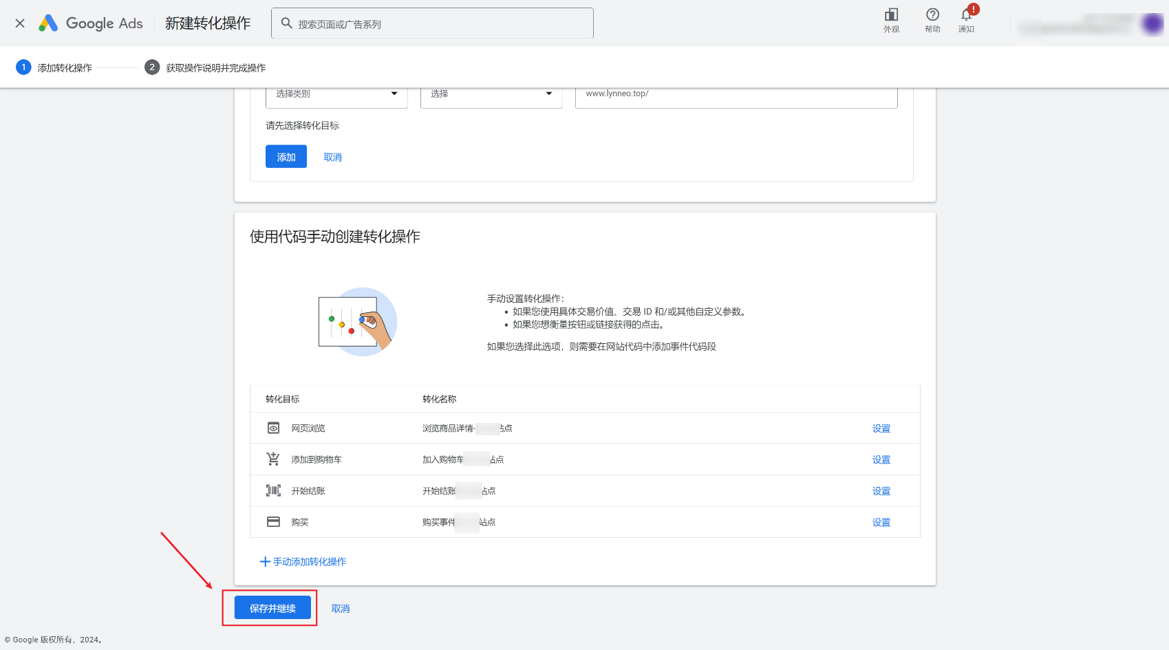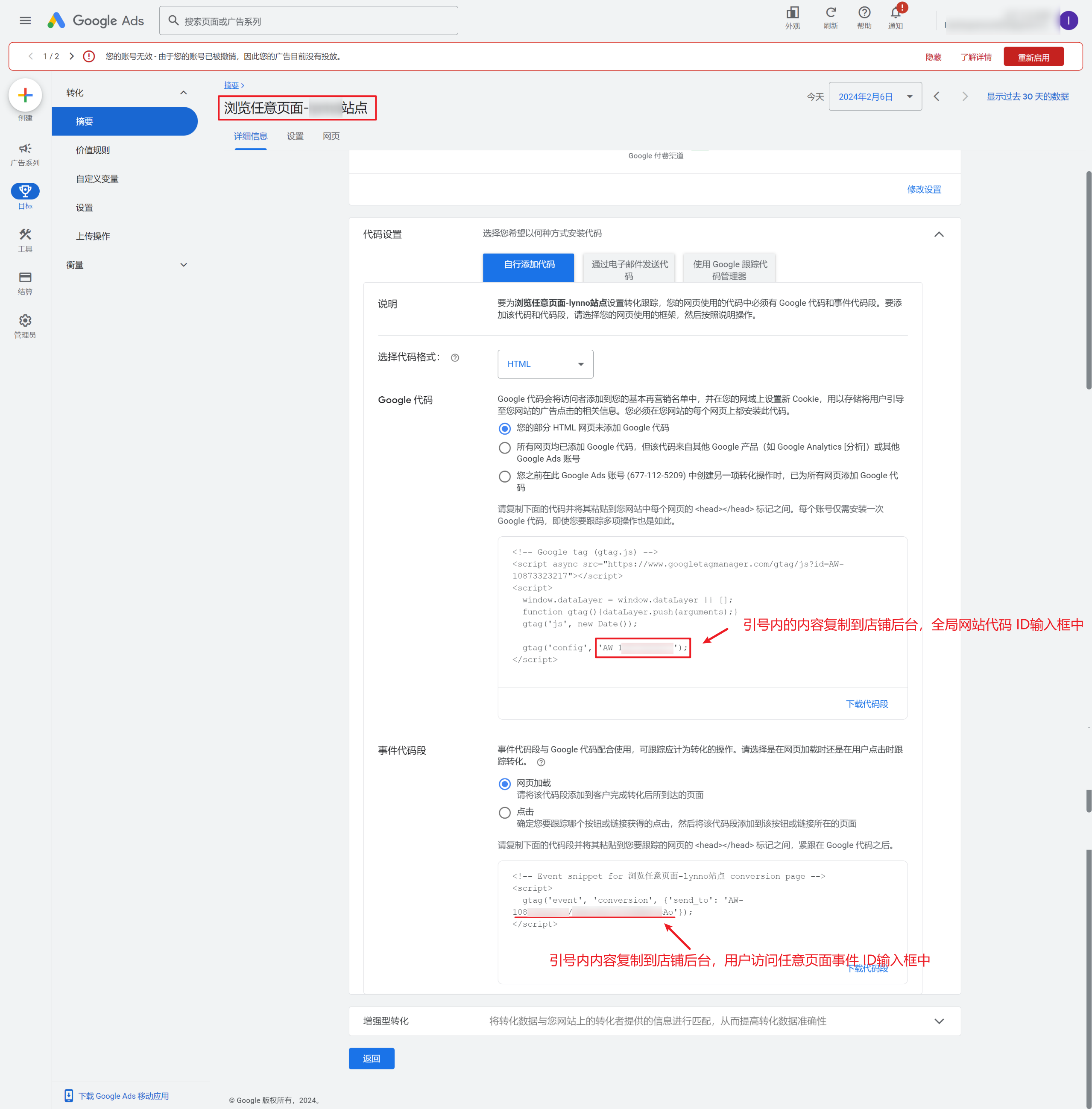 完成Google Ads Tag设置,你需要分别创建“查看商品详情页”、“添加购物车”、“开始结账”、“购买”转化事件,并获取对应的事件ID进行安装。