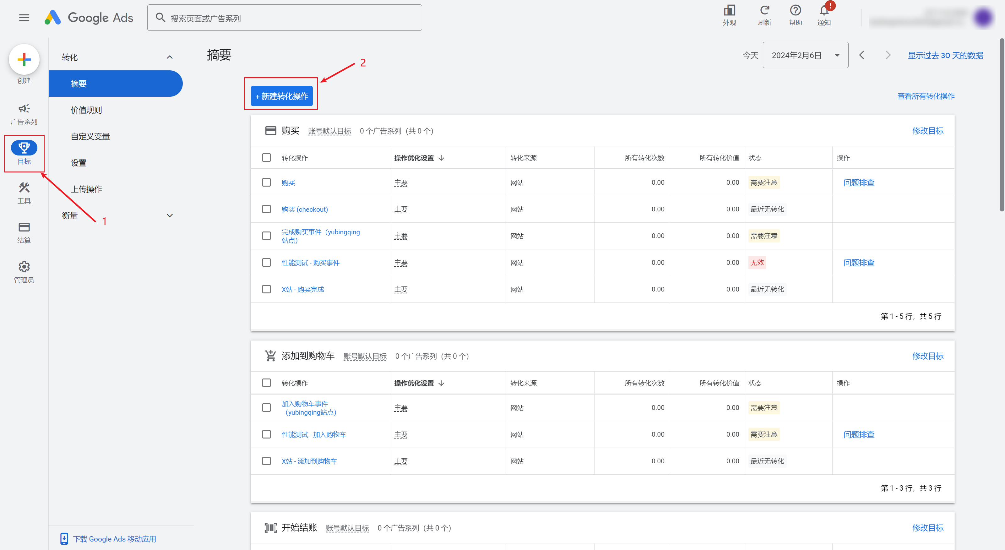 2、点击目标 > 新建转化操作
