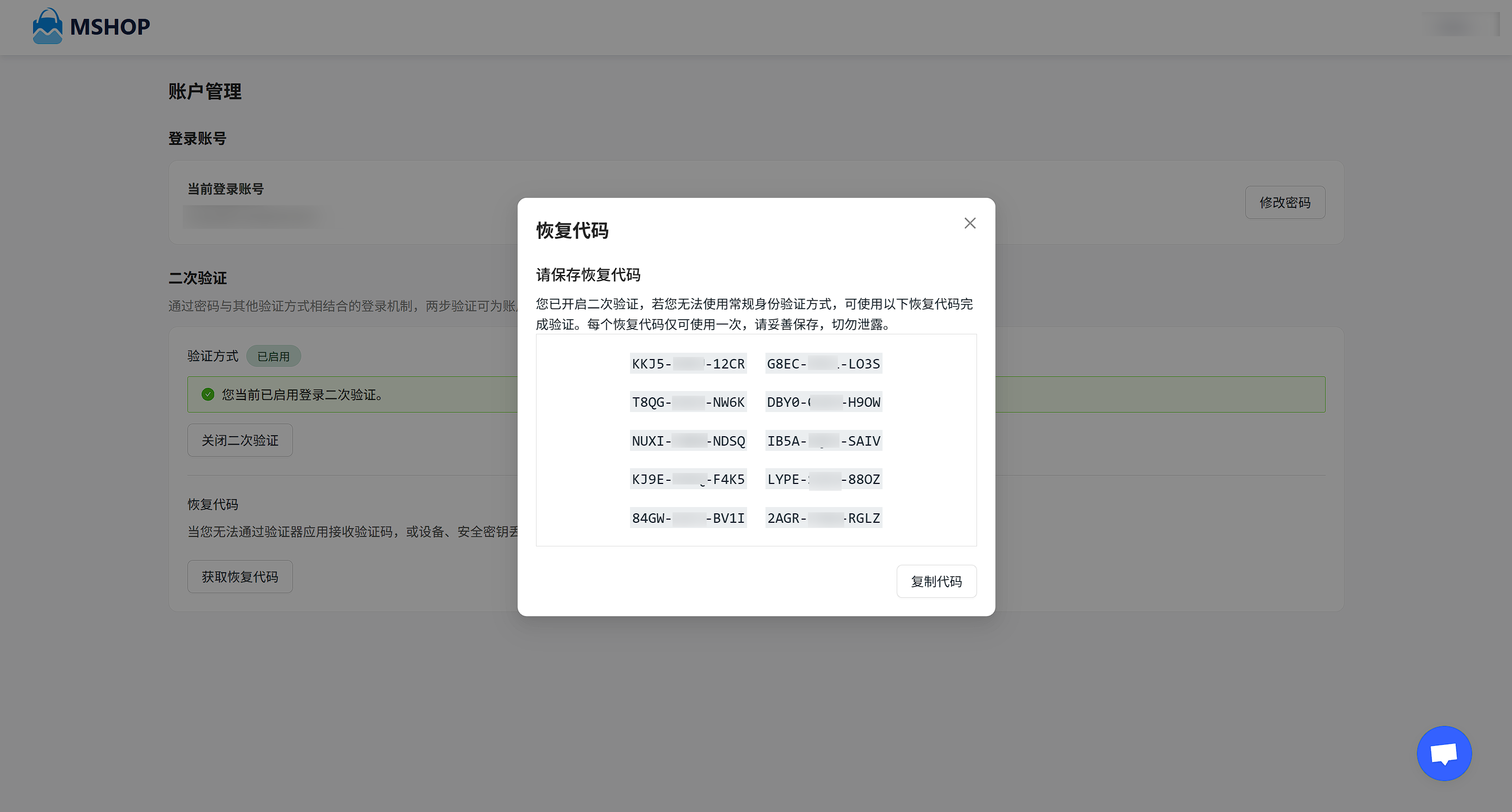 绑定成功后,系统将为您生成 10 个恢复代码(Recovery Codes)。
