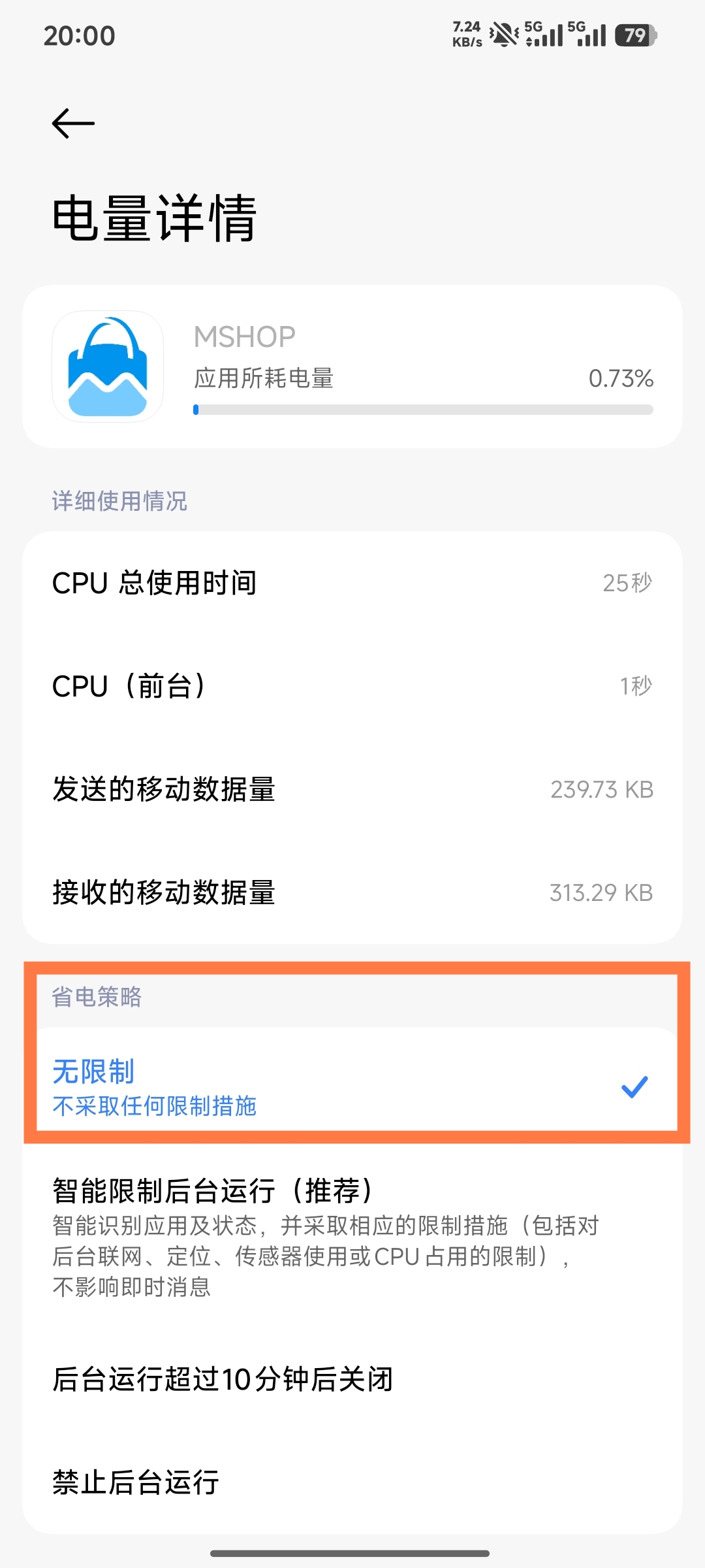 - 在省电策略设置界面中,将MSHOP App的省电模式设置为【无限制】。此设置可避免系统因省电策略限制MSHOP App的后台运行,防止通知推送被拦截。