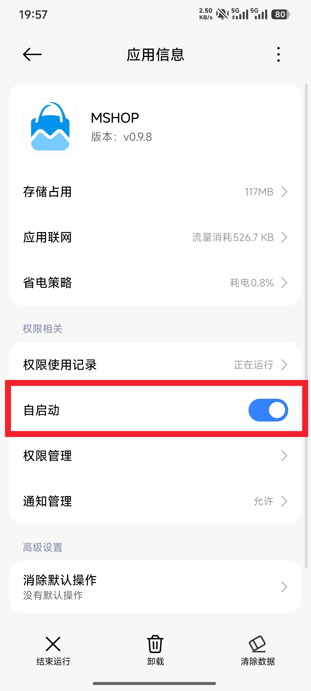 - 在MSHOP App的应用设置页面中,找到【自启动】选项(部分手机显示为“允许自启动”),点击进入后,勾选“自启动”对应开关。开启自启动权限后,可确保手机重启或应用关闭后,MSHOP App能自动后台运行,保障订单通知及时推送。