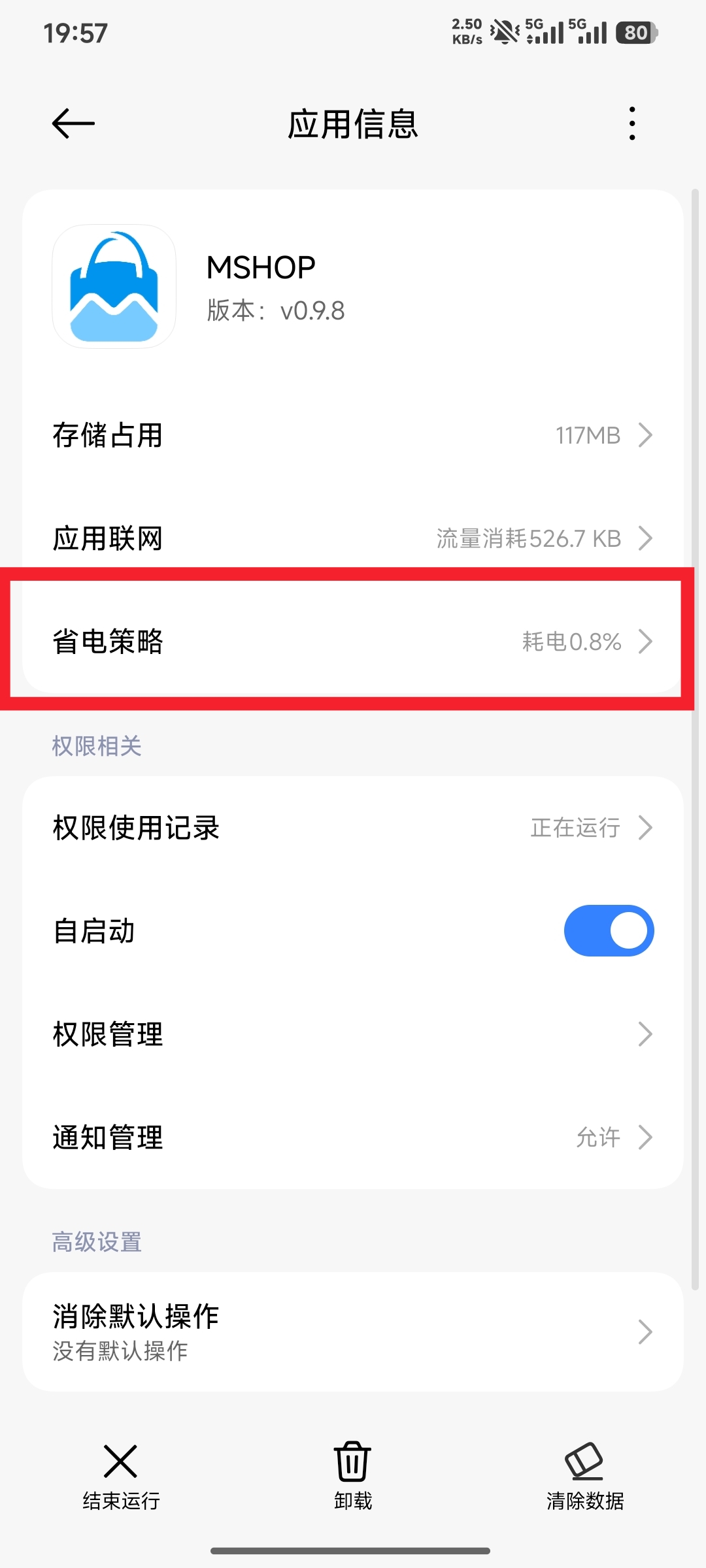 - 在MSHOP App的应用设置页面中,找到【省电策略】选项,点击进入该设置界面。